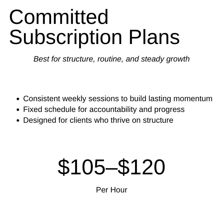 Scheduling and Flexibility✔ Schedule sessions on your own timeline—no weekly or monthly commitments required.